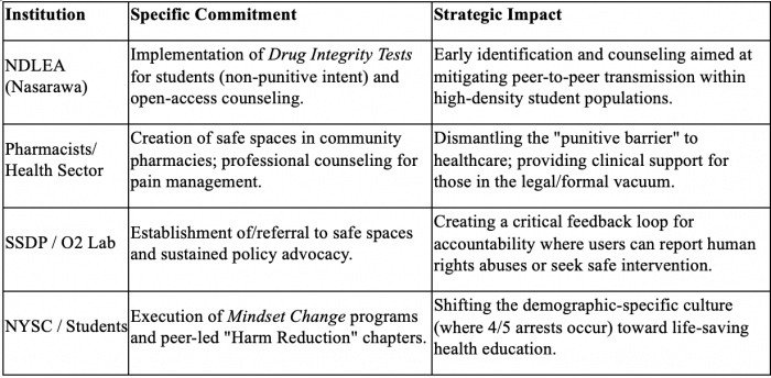 The findings of this dialogue mandate a multi-sectoral shift; the complexities of substance use in Lafia cannot be addressed through the lens of law enforcement alone. To protect human rights, we hold the following institutions accountable for their evolving roles: